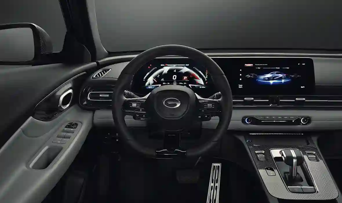 Место водителя GAC EMPOW выполнено в спортивном стиле: руль со скошенной нижней секцией  и меткой нулевого положения, а также дизайн селектора коробки передач, выполненный в авиационном стиле, усиливают спортивную атмосферу салона.